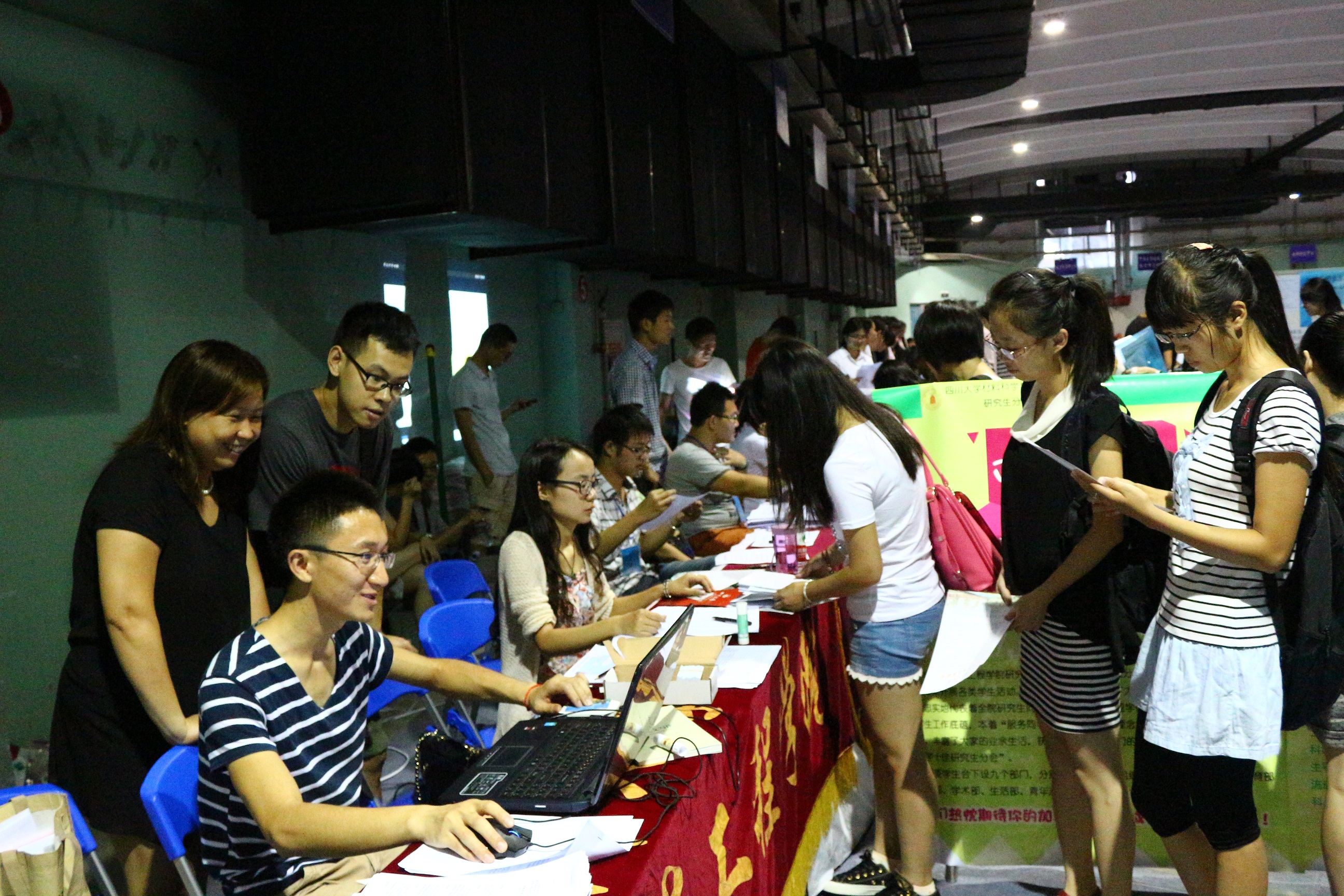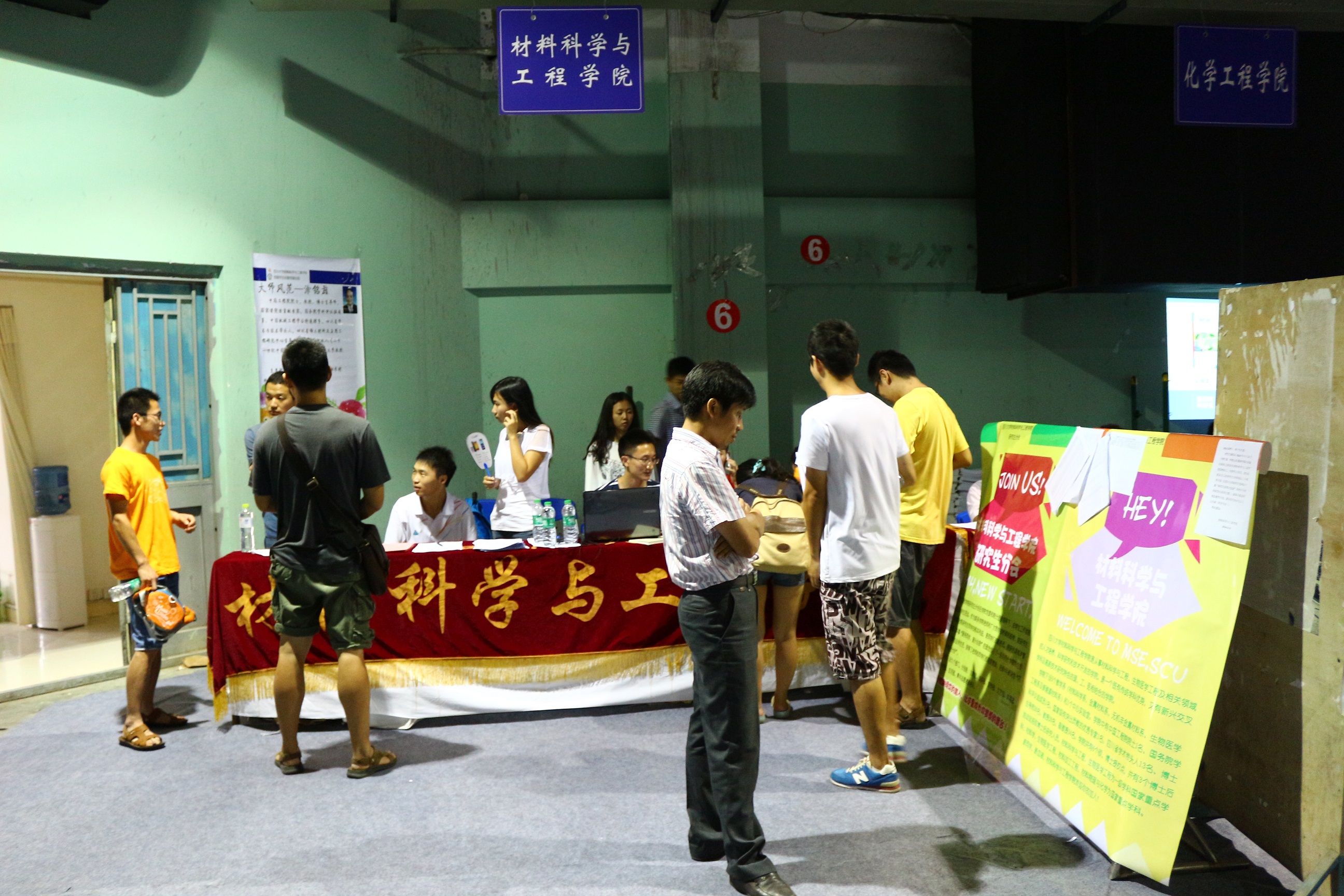 红色横幅、升空气球、巨幕电视、翠绿阳伞,体育馆的别样风景带我们走进了一年一度的迎新季。2014年9月12日,365英国上市集团材料科学与工程学院迎来了2014级硕、博士研究生新生。为期两天的迎新工作中,老师和同学们克服天气炎热的不利条件,圆满完成了迎新工作。