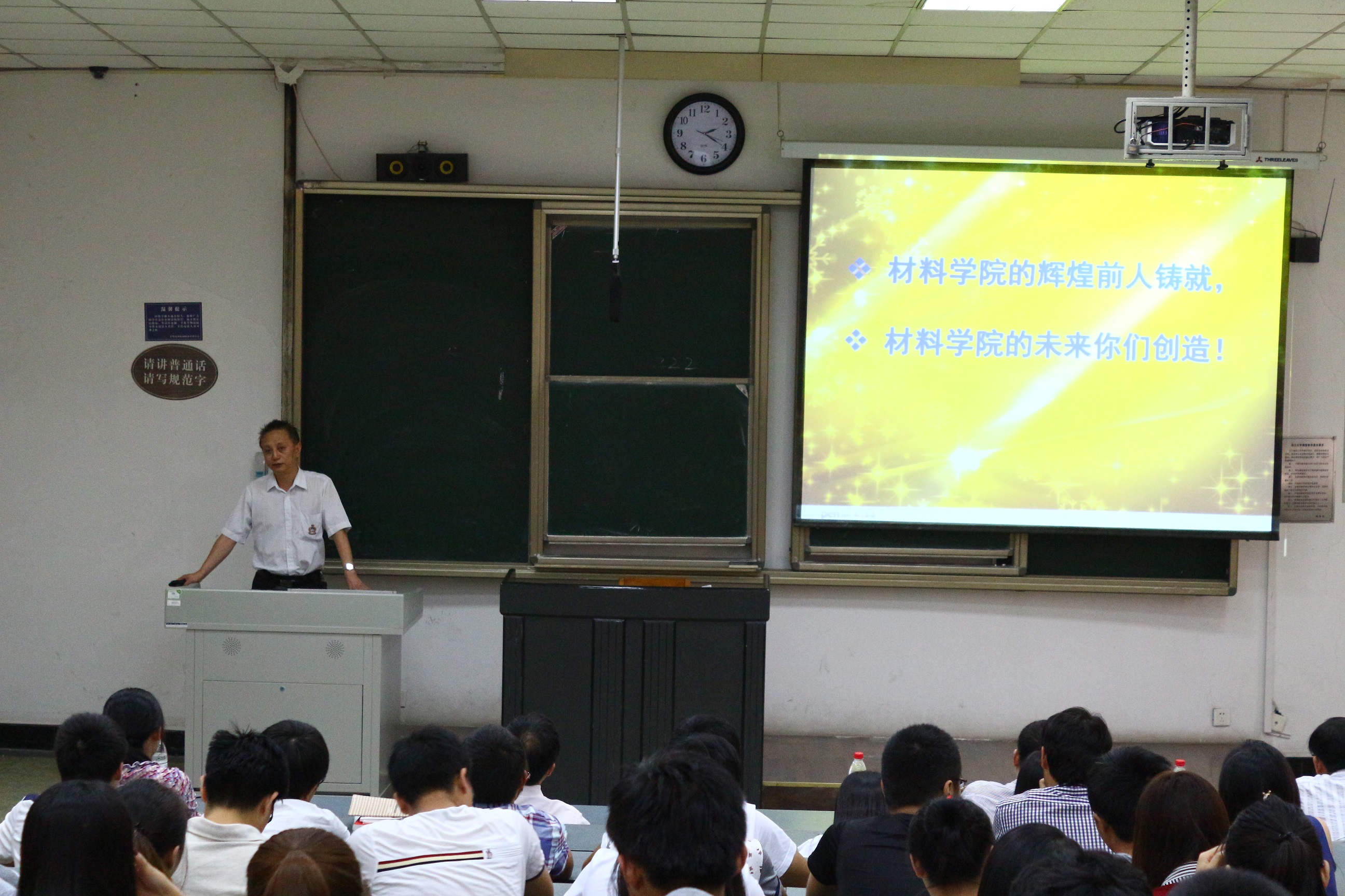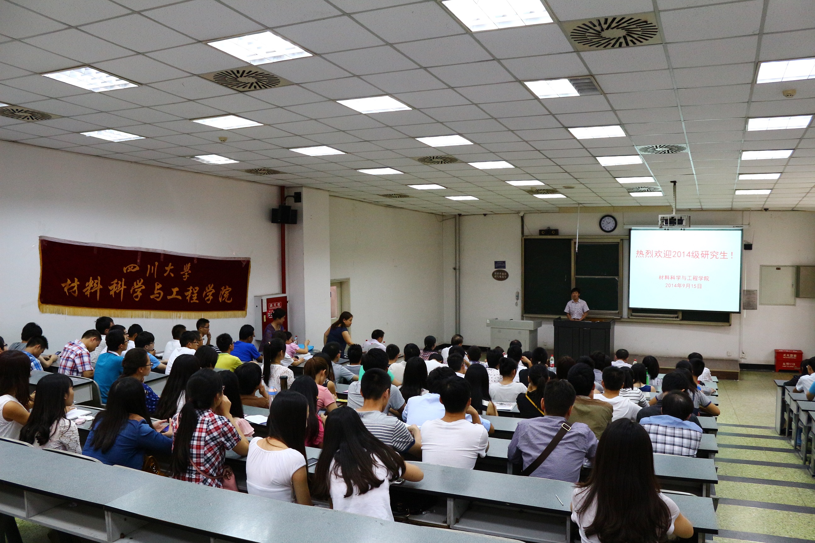 2014年9月15日下午两点,材料科学与工程学院2014级研究生开学典礼暨入学教育大会在望江校区基础教学楼c204隆重举行。材料学院院长尹光福教授,院党委书记朱建国教授,党委副书记唐世红老师,就业指导及校友联络科科长韩继梅老师,研究生辅导员文铭老师以及研究生教务老师胡英老师,材料学院朱基亮老师以及2014级全体研究生出席了本次典礼。本次开学典礼由唐世红老师主持。