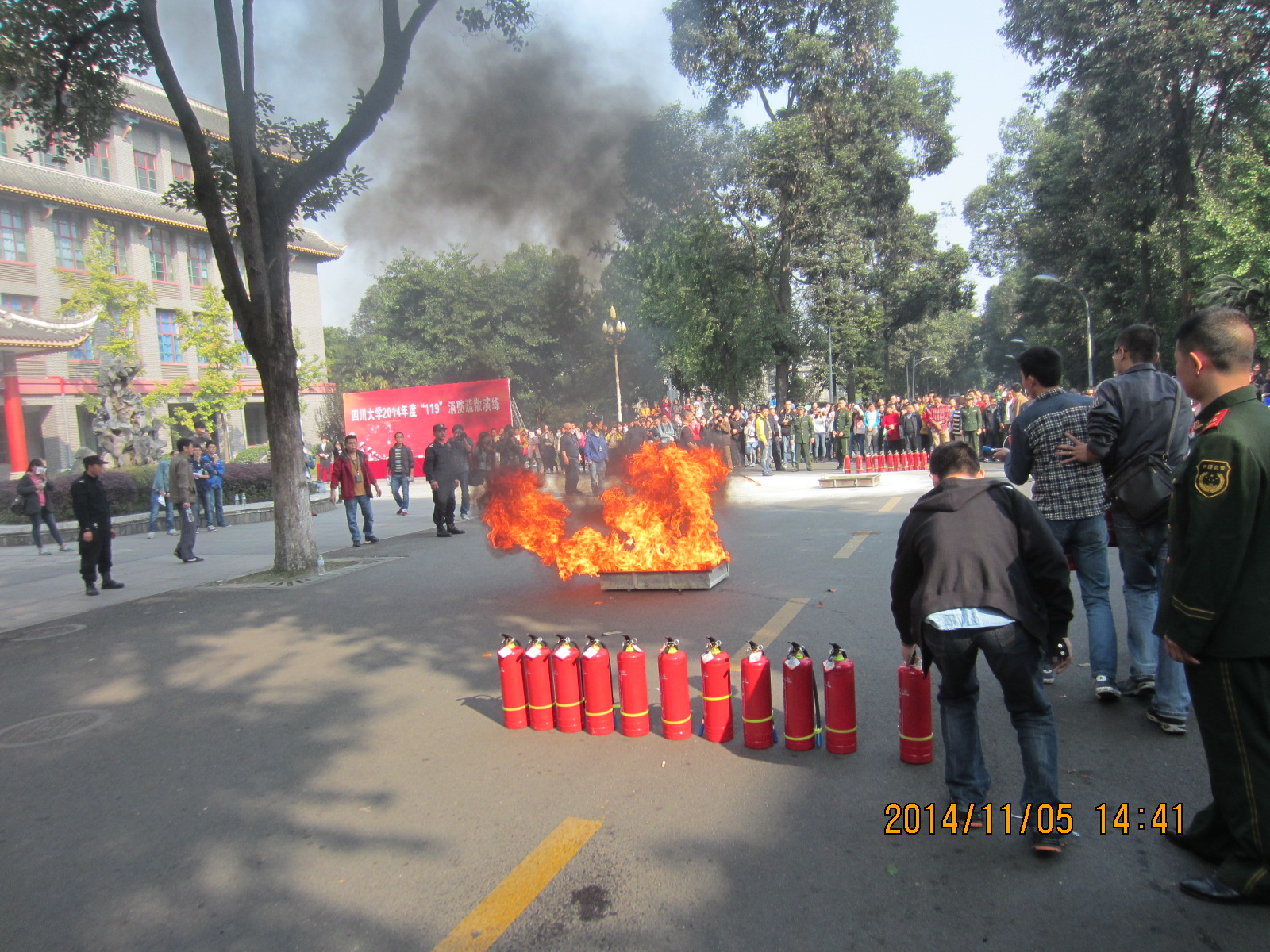 11月5日阳光明媚,由学校党委学工部主办的“365英国上市集团2014年11.9消防疏散演练“在华西校区图书馆广场前隆重举行。我院党委副书记唐世红老师带领辅导员韩纪梅老师 、文铭老师、余鹏飞老师及三名学生代表观摩演练。演练开始后,首先由300名左右的医学学生进入图书馆;而后,图书馆模拟突发大火,同学们迅速按照指挥有序撤出图书馆,未造成重大人员伤亡;与此同时,119火警第一时间赶往火灾现场组织灭火救援,大火被立即扑灭,消防官兵成功解救出受伤同学,并立即送上120救护车。整个演练过程紧张有序,为观摩人员生动地讲解了在火灾中如何救援及自救的常识。