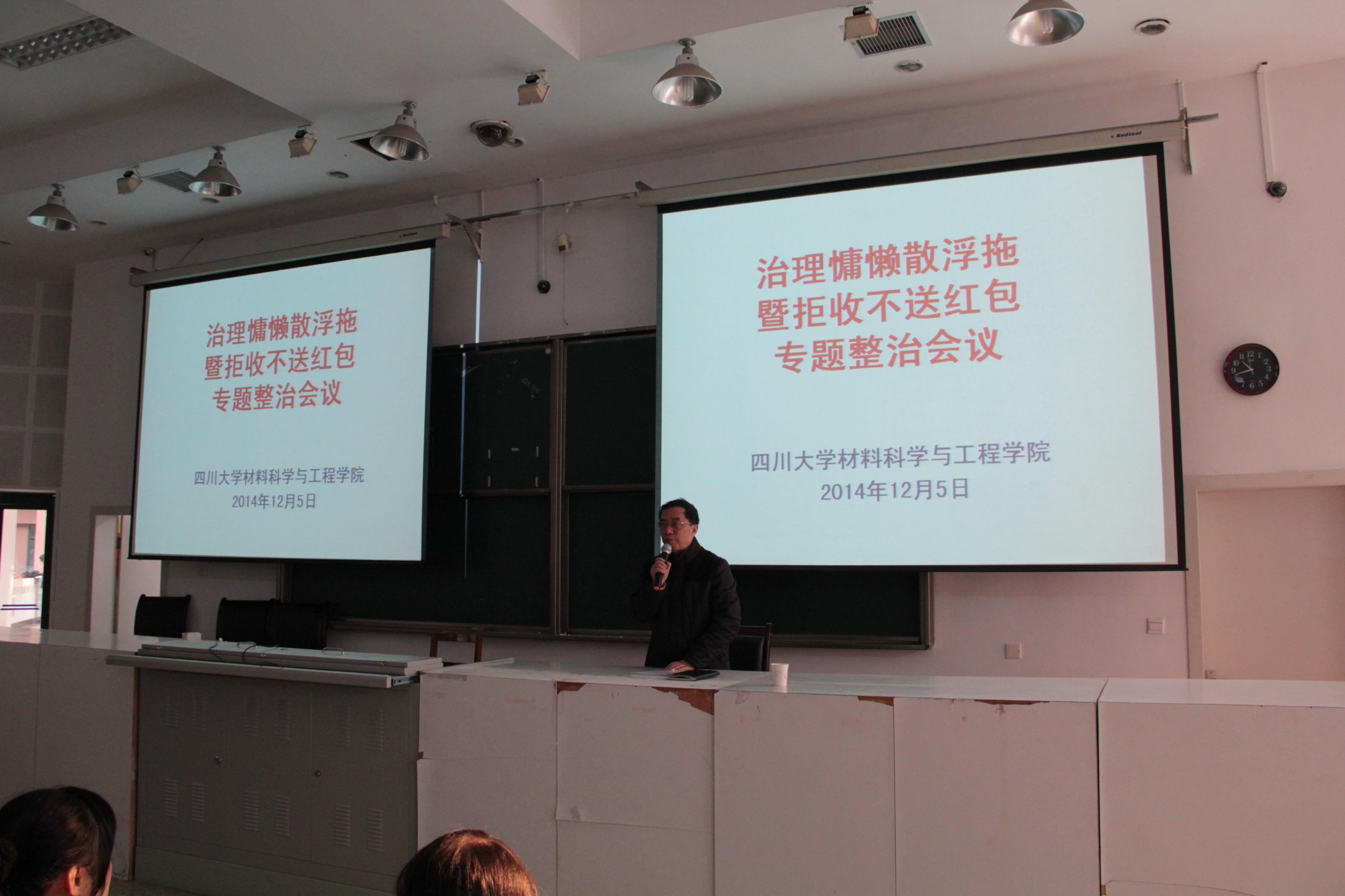 2014年12月5日下午170:0,材料学院“治理慵懒散浮拖暨拒收、不送红包专题整治会议”在研究生院2-101成功举行。参与这次会议的是材料学院全体教职工和党员,会议的主要内容是向全体教职员和党员传达党中央关于拒收、不送红包的文件精神,并签署拒收、不送承诺书,治理可能存在的慵懒散浮拖的风气。