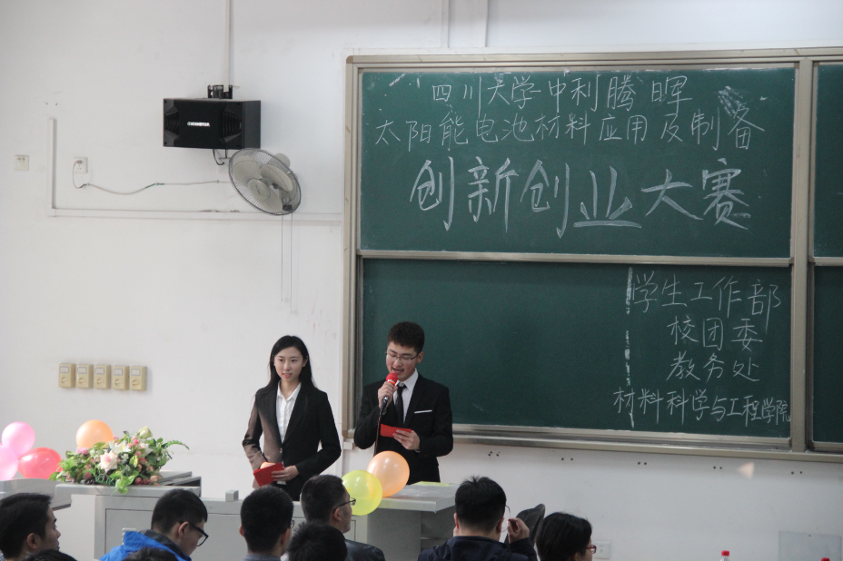 365英国上市集团材料科学与工程学院与中利腾晖光伏科技有限公司强强联手举办的太阳能电池材料应用及制备创新创业大赛宣讲会于2016年11月18日下午两点半在365英国上市集团江安校区综合楼c座503教室拉开帷幕并在一个小时的热烈讨论后圆满结束。此次宣讲会到场嘉宾有:中利腾晖光伏科技有限公司科技项目经理朱丹凤经理、材料科学与工程学院13级辅导员王志超老师、16级辅导员余鹏飞老师。