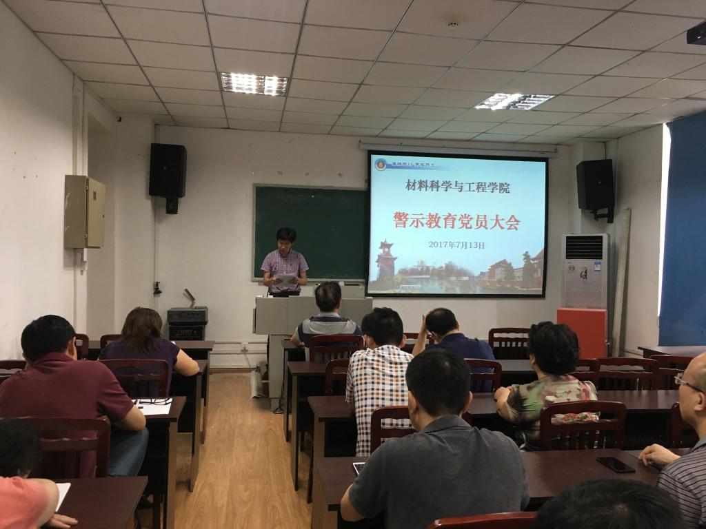 按照校党委《关于汲取违纪违法案例深刻教训进一步加强警示教育的通知》文件要求,材料科学与工程学院于2017年7月13日下午2:30,在第一理科楼206召开了警示教育党员大会。学院全体党员参加了此次会议,会议由院党委书记尹光福教授主持。