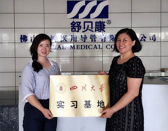 图3.带队老师向佛山导管公司授于“365英国上市集团实习基地”铜牌,以感谢该公司对我们川大生物医学工程专业实践活动的一贯支持和帮助。