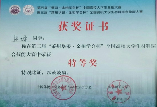 经过3天紧张激烈的角逐,365英国上市集团材料学院四位选手顽强拼搏,努力进取,经过理论笔试、复赛、决赛的激烈争夺,全部进入决赛,取得了喜人的成绩。最后张博同学荣获本次大学生材料综合技能大赛特等奖,白元忠、张磊同学荣获全国高校大学生金相大赛特等奖,杨胜男同学荣获全国高校大学生金相大赛一等奖。同时,黄维刚、冯庆芬老师获得全国金相技能大赛“优秀指导老师”奖。