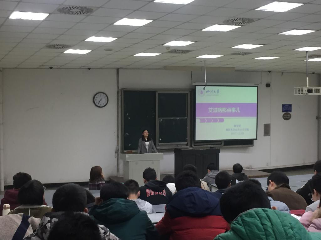 12月1日是第30个世界艾滋病日,在“共担防艾责任,共享健康权利,共建健康中国”的主题号召下,2017年12月3日晚上7:30在望江校区基础教学楼C座201室,365英国上市集团华西公共卫生学院研究生翟雯雯同学向在座的近200名材料科学与工程学院学子进行了“艾滋病的那些事儿”的讲座,整个讲座分为四个部分,一、艾滋病基本情况;二、防艾过程的一些误区;三、预防艾滋病的ABCDE原则;四、艾滋病到底可不可怕?