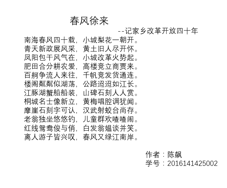 首先,2016级辅导员余鹏飞老师用自己成长经历、生活变化阐述了对家乡改革开放40年以来的体会好人感悟,强调在中国共产党领导下,中国人民凭着一股闯劲、韧劲,用双手书写了国家和民族发展的壮丽史诗,成功走出一条中国特色社会主义道路。由此,抛出了课堂展示的主题内容。然后,同学们依次走上讲台从自己的视角向大家展示家乡40年来的变化。生医丛殿兹、李秋丫组合亲自录制了一段视频向大家展示自己家乡——威海在这40年来的历史变迁,视频一开始由甲午中日海战逐步演变到如今古树上系满的和平安宁红丝带,深刻的展现了新中国成立、尤其时改革开放后人们生活环境翻天覆地的变化和人们生活水平的显著提高;生医陈飙同学以自创一首诗歌《春风徐来》歌颂了安徽安庆40年来的沧桑巨变;金材陈正杰、黄晓文同学以一曲优美的《成都》伴随精美的ppt,展现了改革开放以来天府之国——成都的巨大变化……同学们以PPT、视频、散文、诗词等多种形式一一向大家展示了自己家乡的风土人情及改革开放40年间的变化。