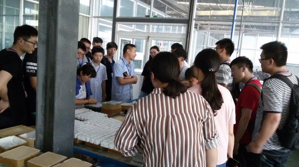 第二天,同学们前往宜宾红星电子有限公司。同样地,在抵达公司后,由公司潘主任及接待人员的引导下,同学们进入会议厅,观看公司宣传片,并由公司负责人员介绍公司相关情况。红星电子公司为原国营七九九厂,现以生产电子陶瓷、旋转开关、汽配零件为主要业务。值得指出的是,该公司是国内最早研制和生产氧化铍特种陶瓷的专业厂家;是全国唯一军用氧化铍陶瓷定点生产商,生产的氧化铍陶瓷及其金属化系列产品,生产能力和技术水平在国内处于领先地位;近年来,从美国引进了氧化铍陶瓷基础生产技术,通过消化吸收进行国产化,形成了一套具有自主创新、自主知识产权的氧化铍陶瓷生产工艺技术,生产的氧化铍陶瓷制品某些性能指标已接近美国标准,且部分指标已超过美国标准。在听完公司介绍后,在接待人员陈老师的带领下,同学们参观了产品展厅,近距离接触公司产品。参观完产品展厅后,在接待人员和技术人员的带领下,同学们参观了公司三大产品的生产线,包括电子陶瓷生产线、机电装配与检测车间,汽配零件生产车间等。