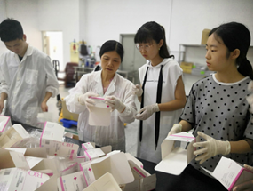 到达次日,在人事部肖老师的带领和指导下,同学们参观了公司的生产线,并了解了产品的实际生产流程。随后的实习过程中,同学们首先学习了酶联免疫诊断试剂盒相关基础知识,接下来在保证自身安全的前提下,同学们进行了“梅毒螺旋体抗体酶联免疫诊断试剂盒(双抗原夹心法)”的外包装处理,并进入生产线了解流水线拼装工作的快捷性和准确性。由于生物试剂的特殊性,组装好的成品经检验合格后按要求存放至冷库合格品库中。