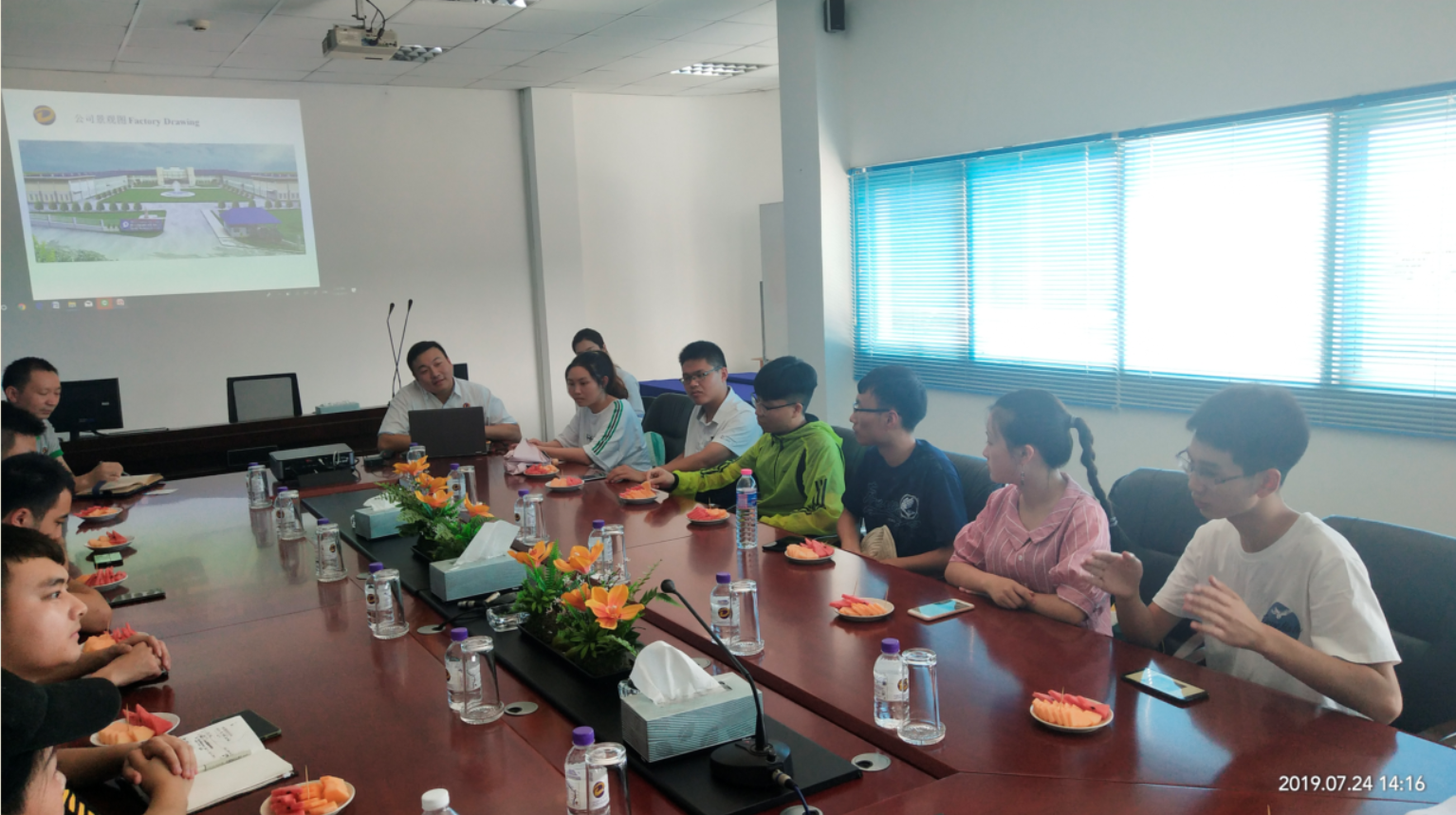 实习队考察了工业园入驻企业:亚洲复合材料(泰国)有限公司和德晋昌光电科技(泰国)有限公司。亚洲复合材料(泰国)有限公司是目前泰国唯一的一家玻璃纤维短切毡生产厂家,年产无碱玻璃纤维制品万余吨,并正在建设东南亚第一座池窑玻纤生产线,是四川威玻新材料集团在泰国的分公司;德晋昌光电科技有限公司主要从事光电产品的技术研发和生产销售,在泰国、惠州、昆山、吉安等多地建有生产基地,德晋昌(泰国)也是泰中罗勇工业园中国商会的会长企业单位。
