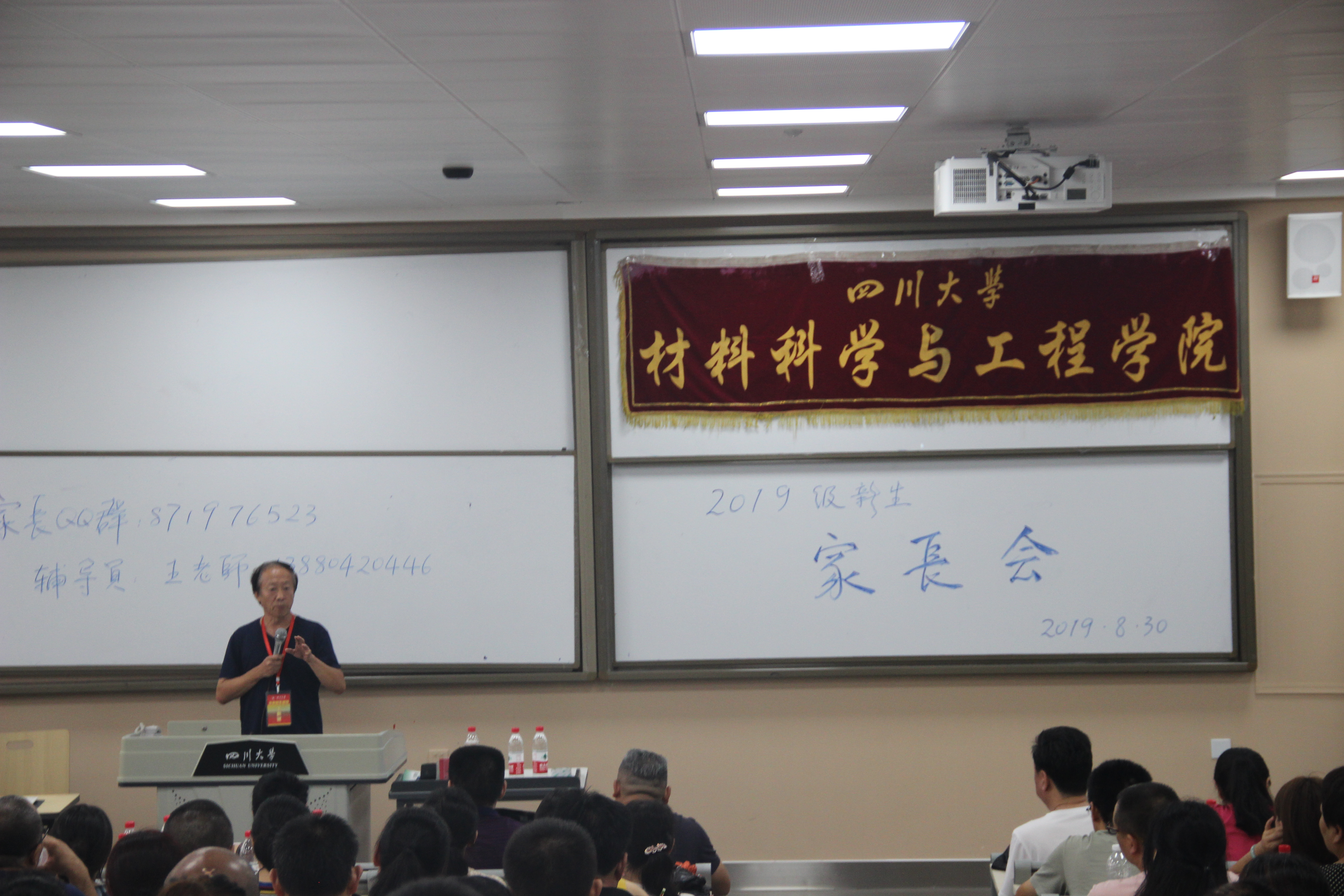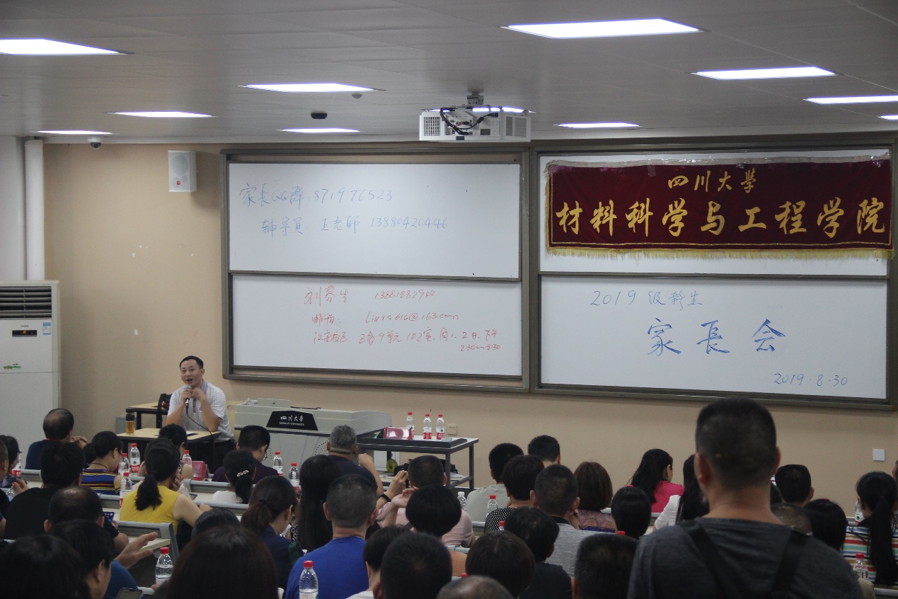 为了确保家校沟通顺畅、共同培育好大一新生,2019年8月30日下午,材料科学与工程学院在江安校区一教D503隆重举行2019级新生家长会。学院党委副书记张晓满教授、教导员刘蓉生老师以及2019级辅导员王静老师到场参与交流。