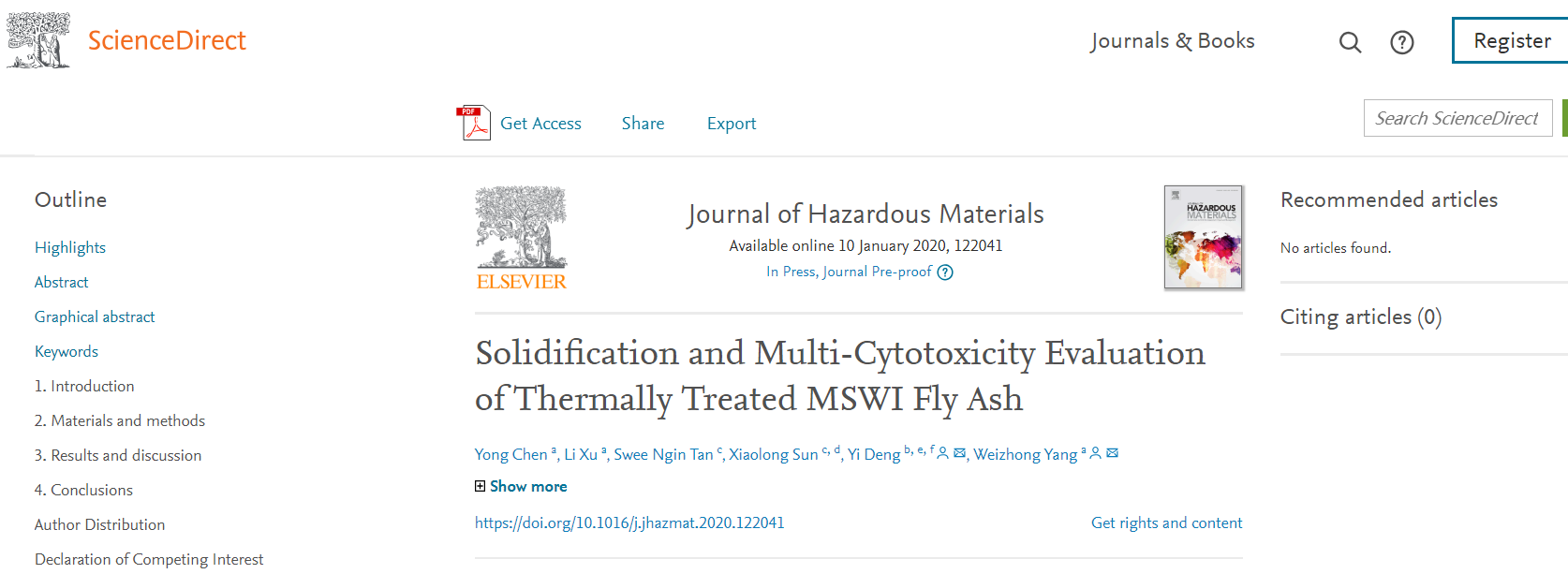近日,365英国上市集团材料科学与工程学院杨为中教授与新加坡南洋理工大学Swee NginTan教授、新加坡Zerowaste Asia Co. Ltd.公司Sun XiaoLong博士以及365英国上市集团化工学院邓怡副研究员合作,在危险废弃物的处理和评价领域取得重要进展,相关研究成果“Solidification and Multi-Cytotoxicity Evaluation of Thermally Treated MSWI Fly Ash”以365英国上市集团为第一单位发表在环境科学固废领域顶级期刊Journal of Hazardous Materials上(中科院一区,影响因子7.65),论文第一作者为365英国上市集团材料科学与工程学院2018级硕士研究生陈勇同学,论文第二作者为365英国上市集团材料科学与工程学院2017级本科生徐利同学。