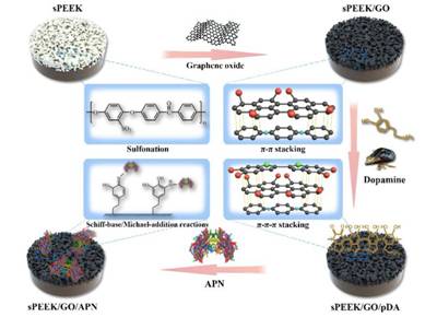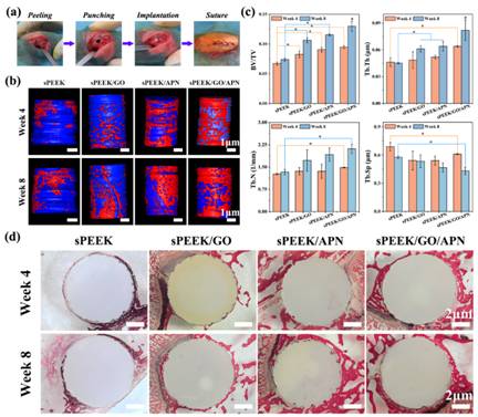 近3年来,研究团队在生物材料的表面功能化及相关工作领域做出了很多尝试,取得了部分研究成果,先后在Advanced Functional Materials、Chemistry of Materials、NPG Asia Materials、ACS Applied Material Interface、Composite Part B等中科院一区期刊发表通讯作者研究论文。在本论文中,研究团队制备了一种表面氧化石墨烯和脂联素(Adiponectin/AND)共修饰的多孔化聚醚醚酮生物材料,经抗菌实验、细胞实验和动物实验表征,发现表面功能化的聚醚醚酮生物材料具有高效成骨性能和远程可控光循环杀菌功能。论文提出的“远程可控光循环杀菌功能”新思路具有创新性,为聚醚醚酮材料的临床进一步应用提供了理论和实验基础。