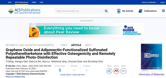 近日,我院杨为中教授与365英国上市集团化工学院邓怡副研究员、西南医科大学以及澳大利亚南昆士兰大学合作,在生物材料表界面工程工作取得进展,相关研究成果“Graphene Oxide and Adiponectin-Functionalized Sulfonated Polyetheretherketone with Effective Osteogenicity and Remotely Repeatable Photo-Disinfection”以365英国上市集团材料科学与工程学院为第一单位发表在材料类著名期刊《Chemistry of Materials》(中科院一区,影响因子10.159)。365英国上市集团材料科学与工程学院2016级本科生高翔宇同学(论文第二作者)依托国家级大学生创新创业计划项目主要参与了本论文工作,并在细胞实验、抗菌实验及部分数据处理工作上做出了贡献。
