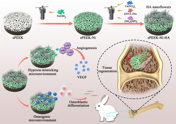 聚醚醚酮(PEEK)由于其优异的生物相容性、化学稳定性以及与人骨相近的弹性模量,成为了主流的高分子植入材料。然而其固有的生物惰性以及不足的血管再生,导致其骨整合能力较差,从而使得其体内长期稳定性差,甚至会出现松动、脱落的现象。针对以上问题,本课题组一方面通过在3D多孔PEEK表面制备了由羟基磷灰石纳米花构成的“纳米无序”结构,通过独特的三维表面结构来调控成骨细胞以及血管内皮细胞的粘附和铺展,促进植入体与细胞的相互作用;另一方面,通过植入体在体内长效释放Ca2+和Ni2+,通过Ca2+和Ni2+的协同作用,调控其成骨和成血管性能,从而获得更佳长期骨整合稳定性。体内外实验结果表明,本研究为PEEK的长期骨整合稳定性提供了简便有效的策略。