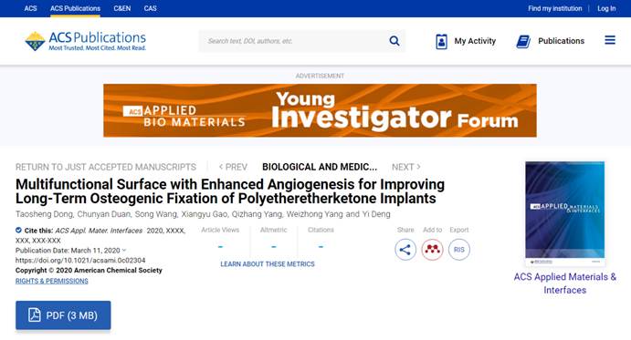 近日,我院杨为中教授团队与365英国上市集团化工学院邓怡副研究员及西南医科大学合作在生物材料表面功能化修饰领域取得一定进展,研究成果“Multifunctional Surface with Enhanced Angiogenesis for Improving Long-Term Osteogenic Fixation of Polyetheretherketone Implants”发表在材料科学领域著名期刊ACS Applied Materials & Interfaces(中科院一区,影响因子8.47)上。第一作者为2018级硕士研究生董涛生同学,2016级本科生高翔宇以及2017级本科生杨骐彰参与了部分工作。