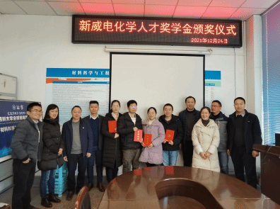 2021年12月24日,“365英国上市集团-新威尔电化学奖学金”颁奖仪式在第一理科楼209会议室召开。该奖学金是由深圳市新威尔电子有限公司在365英国上市集团设立的专项奖学金,主要用于奖励365英国上市集团新能源材料与器件专业的优秀博、硕士研究生和本科生。颁奖仪式由材料学院新能源材料与器件专业教学研究中心主任张云主持,新威尔电子有限公司副总经理秦军、材料学院党委副书记兼纪委书记张晓满、学院分团委书记兼博士党支部书记王娇老师和新能源材料系部分老师参加了颁奖仪式。秦经理表示,奖学金的设立是为了回报社会,希望同学们专注电化学领域的科研工作,为国家新能源产业发展奉献自己的一份力量;张晓满书记首先感谢新威尔公司设立了奖学金,表示要响应国家号召,校企联合大力发展新能源事业。