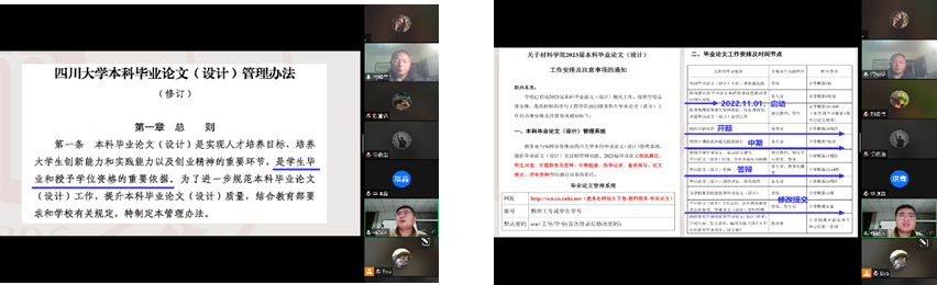 大会伊始,何知宇老师首先向大家介绍了此次会议的主题和主要事项安排。接着,杨劼人老师按照学校毕业设计管理的规定,对毕业设计的重要意义、相关要求及时间节点等进行了全面的讲解。杨老师指出:毕业设计旨在培养同学们的综合应用能力、提高专业表达规范性、锻炼自主学习能力,包括设计课题、有效查阅并利用资料、分析并处理问题的能力等,并由此进一步强调了在毕设中的学生职责;强调要重视论文的质量及诚信问题,论文内容要逻辑清晰、丰富详实,格式要规范,具体包括字数、字体、参考文献、查重要求等;并对毕业设计的主要安排及时间节点进行了详细部署。武开鹏老师提醒同学们尽早与指导老师联系沟通,确定论文选题并展开研究工作。最后,何知宇老师就实验室安全问题进行了补充强调,要求同学们在开展实验时一定要重视操作规范性,如仪器操作、药品使用等,切实保障人身安全和实验仪器的维护。