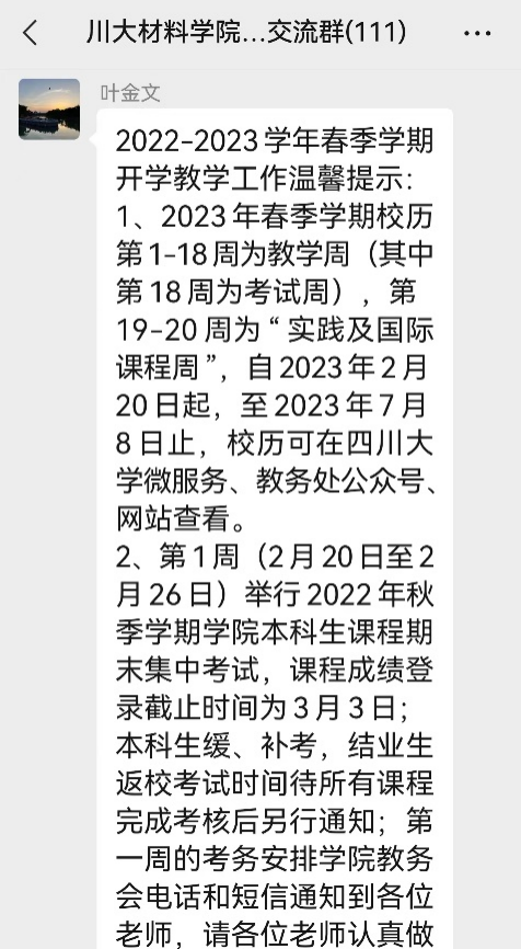 学院教学管理科室认真做好教学准备工作,确保教学工作有序开展,保障各教学实践环节的运行质量。一是完善课程监督体系。开学前夕,学院成立了由院领导班子、辅导员、教学秘书、教务干事组成的教学检查小组,制定新学期教学检查方案。二是畅通教育教学沟通渠道。学院教务办向本科和研究生课程负责人发送开学提醒短信,督促课任老师建立课程交流群,掌握学生的课程学习情况。三是做好第一周期末考试的准备工作。2022年秋季学期受疫情影响,期末集中考试调整到本学期开学第一周进行,重点提醒主考、监考老师准时到岗,有序组织期末考试。四是做好学生返校报到工作。通知学生按时返校并完成报到注册,为2月20日-26日的期末集中考试做好迎考准备。