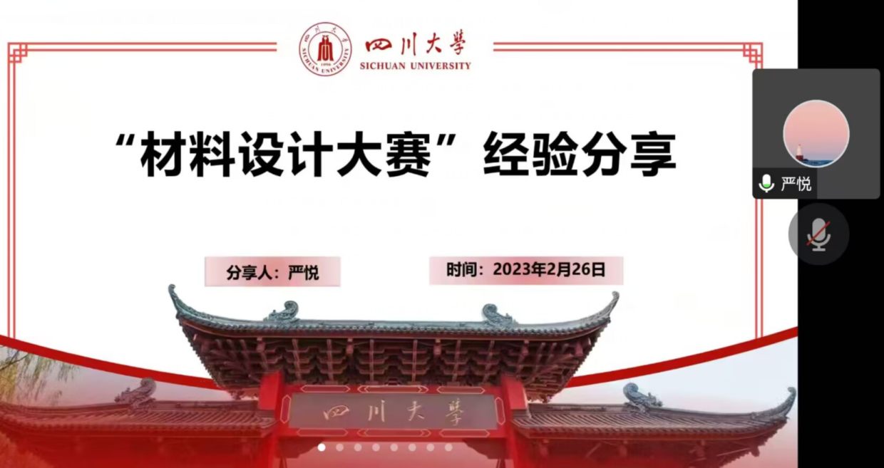 在宣讲会中段,由雷博睿学长分享自己的比赛经历,并对材料知识进行了科普和讲解。他从解释材设大赛名字的由来入手,分析材料设计大赛的同时,也提出了所设计的参赛材料要兼具创新性和可行性的观点。另外,雷学长也在线上进行了精彩的五分钟答辩演示,给将要参赛的队伍提供参考,专业客观、言简意赅的阐明了他所带领的团队将参赛的PTC热敏电阻材料在实验和应用领域展现的可行性和可拓展性。雷博睿学长的精彩分享后,由严悦学姐分享参赛经验,帮助同学们在参赛时规避弯路,尽快入题。同时,严学姐建议参赛选手在展现题材时要简洁大方、强调重点,同时结合比赛要求制定大纲。严学姐所带来的高分子纳米材料也给予大家学科交叉、创新融合的比赛思路。