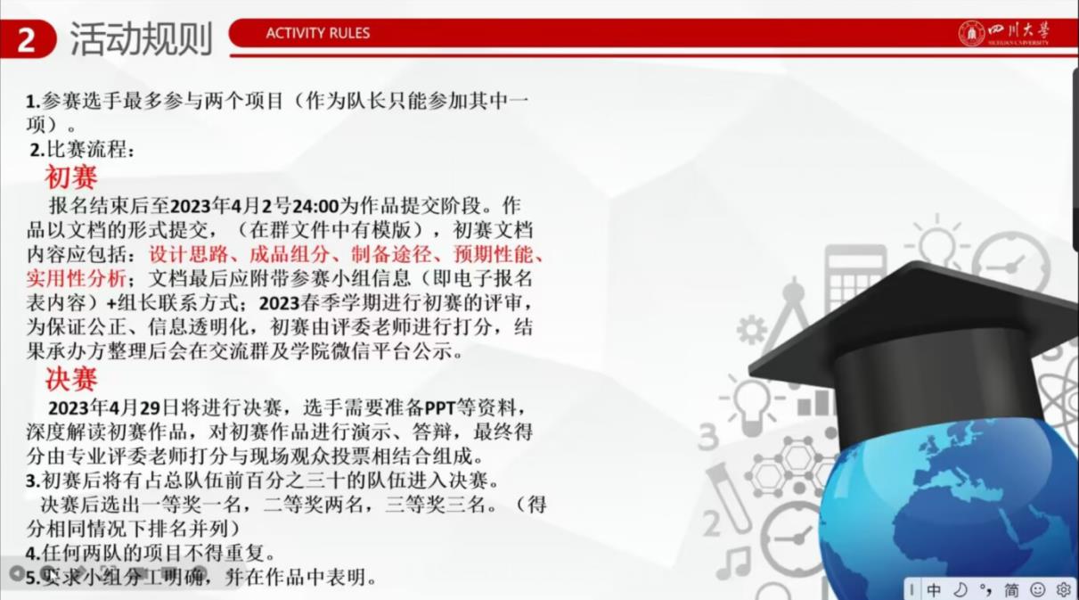 此次宣讲会邀请到了主持国家级大创项目的严悦学姐以及担任“互联网+”、挑战杯等项目负责人的雷博睿学长作为主讲嘉宾分享相关赛事经验。并由材料分科协成员介绍赛事规则、赛事流程。期间线上同学们积极发问,营造了良好的问答氛围。