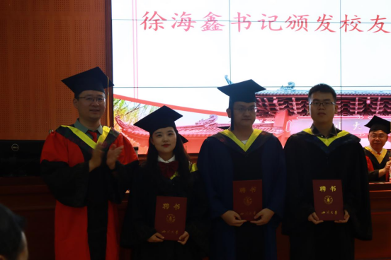 徐海鑫书记为毕业生代表颁发校友联络人聘书,希望联络员们能在走出校门后,继续团结全体2023届毕业生,互帮互助,共同进步,以后常回母校看看。