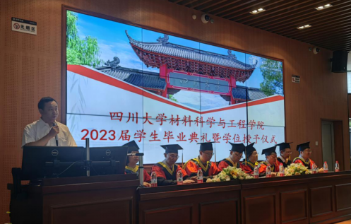 典礼上,张晓满副书记首先介绍了到场嘉宾并表达了诚挚的感谢,他精彩的开场白诉说着对学生们的肯定与不舍。刘颖院长对顺利完成学业的本硕博毕业生表示热烈祝贺,并向辛勤培育同学们的父母以及老师致以衷心的感谢!刘颖院长讲到:昨日的拼搏会铸成今日的成功,只要坚持拼搏,未来会愈加辉煌!同学们要常怀感恩之心,饮水思源,牢记校训“海纳百川,有容乃大”,牢记自己是川大材料人。