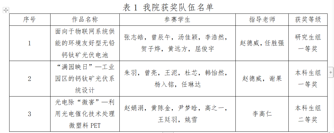 我院参赛团队结合学院新能源材料与器件专业特色,将“节能减排,绿色发展”的理念贯穿始终。在学校和学院的大力支持下,我院研究生科技类项目“面向于物联网系统供能的环境友好型无铅钙钛矿光伏电池”和本科生科技类项目“‘满园映日’—工业园区的钙钛矿光伏系统设计”均荣获一等奖,本科生科技类项目“光电除‘微害’—利用光电催化技术处理微塑料PET”荣获二等奖。