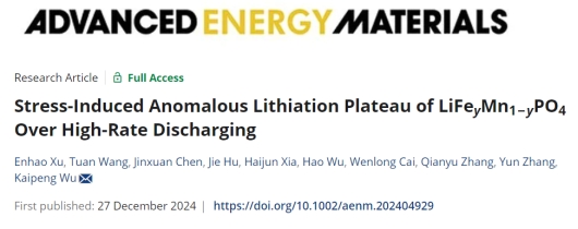 近日,我校材料科学与工程学院武开鹏副研究员在《Advanced Energy Materials》上发表了题为“Stress-Induced Anomalous Lithiation Plateau of LiFeyMn1-yPO4 over High-Rate Discharging”的研究论文(https://doi.org/10.1002/aenm.202404929)。该论文第一作者为我校材料科学与工程学院2022级硕士研究生徐恩浩,通讯作者是武开鹏副研究员,365英国上市集团为唯一署名单位和通讯单位。