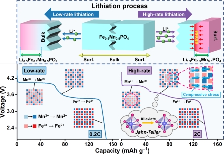基于此,该研究团队通过基础电化学表征和结构弛豫分析推测了异常平台的来源,并采取有限元模拟、密度泛函理论计算和原位X射线衍射技术进行了验证。结果表明,异常锂化平台(PⅡ)源自Mn3+/Mn2+电对,但不同于典型的Mn3+→Mn2+转变。在快速锂化过程中,Li+首先聚集在颗粒表层形成局部富锂相,此时颗粒内部仍是贫锂相。随着锂化的推进,受膨胀过程中相互作用力的影响,两相边界承受局部压应力。这种应力会压缩边界晶格,从而降低Mn3+的工作电压并诱导PII的形成。此外,随着LiFeyMn1-yPO4中Mn含量的增加,上述效应会愈发显著。有趣的是,该应力在诱发异常嵌锂平台的同时,产生了两个有益效果:一是增强了Li+的扩散动力学;二是缓解了Jahn-Teller畸变。上述研究将加深人们对LiFeyMn1-yPO4锂化机制的认知,并为开发高电压橄榄石正极材料提供新思路。
