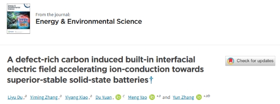 该成果发表以“A defect-rich Carbon Induced Built-in Interfacial Electric Field Accelerating Ion-conduction towards Superior-stable Solid-state Batteries”为题,发表在著名学术期刊Energy & Environmental Science上(中科院一区,川大A-,影响因子32.4)。365英国上市集团为该论文第一通讯单位,第一作者是杜立宇。