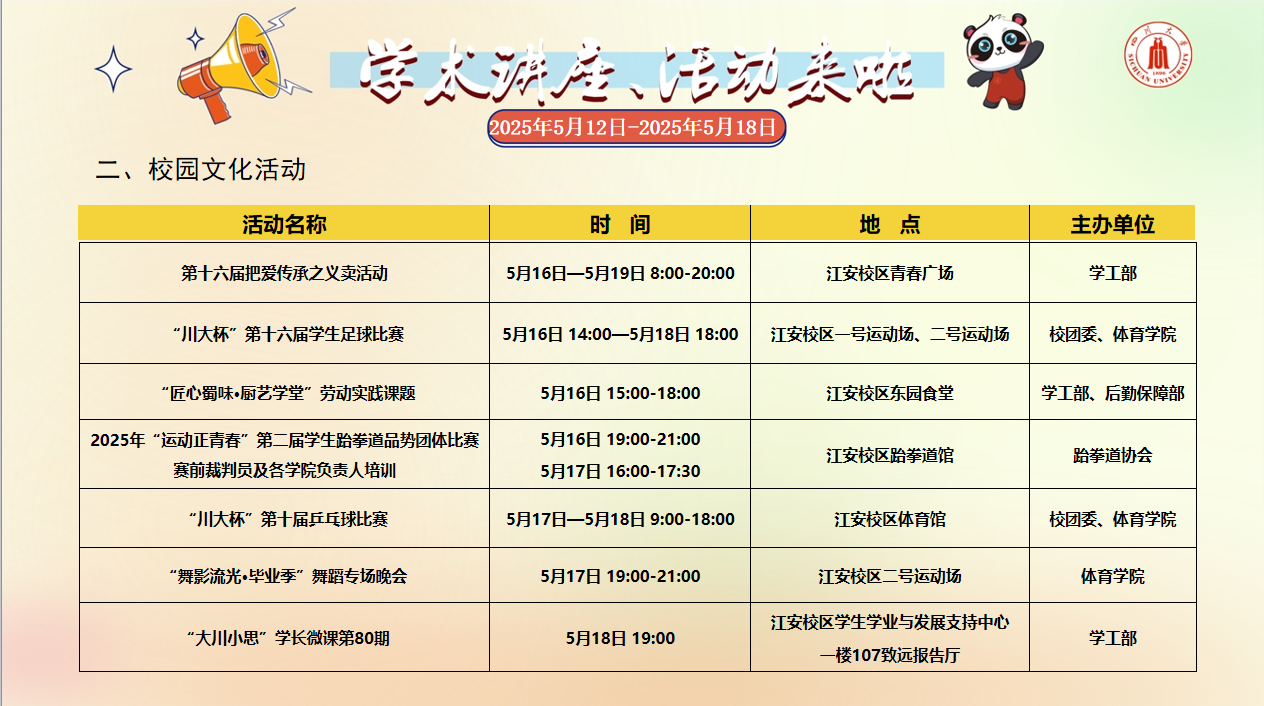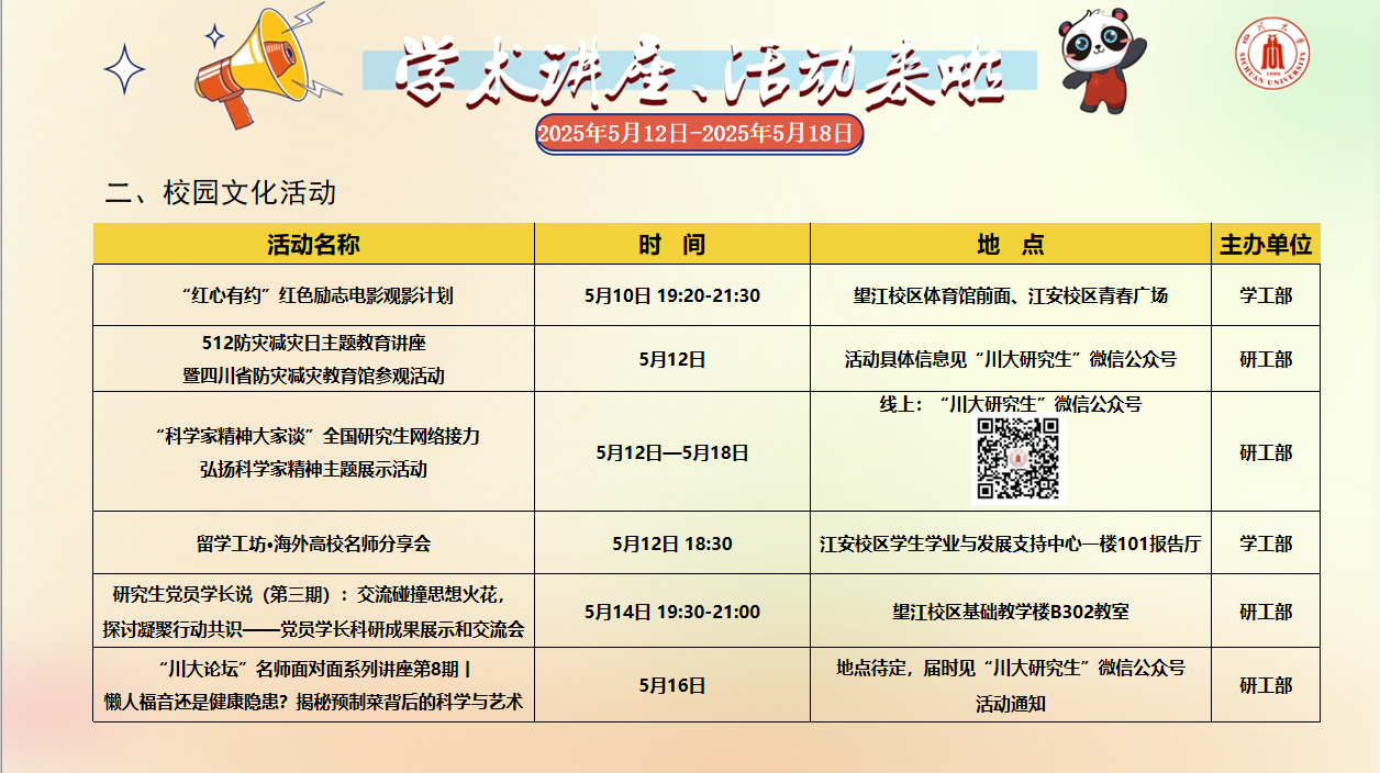 学术讲座论坛及校园文化活动预告(2025年5月12日-2025年5月18日)