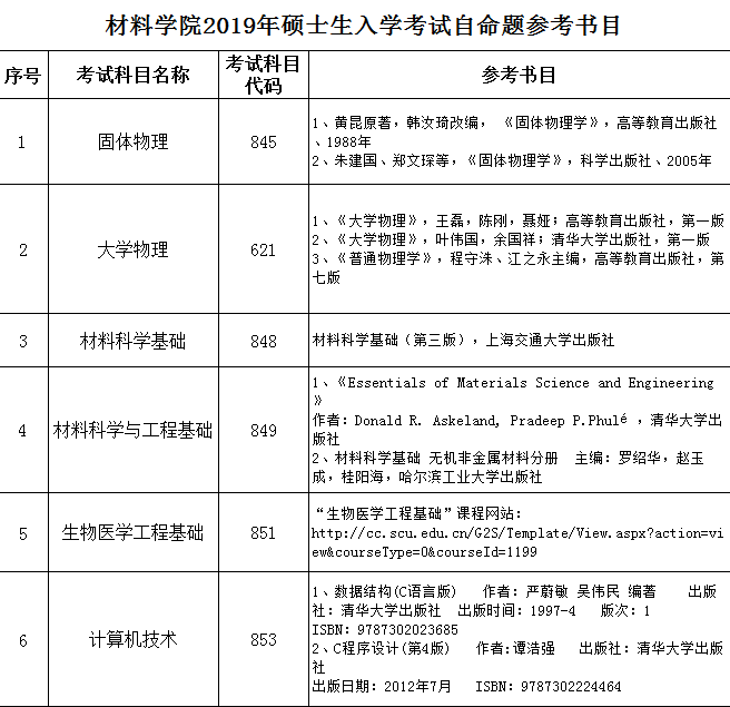 材料学院2019年硕士生入学考试自命题参考书目