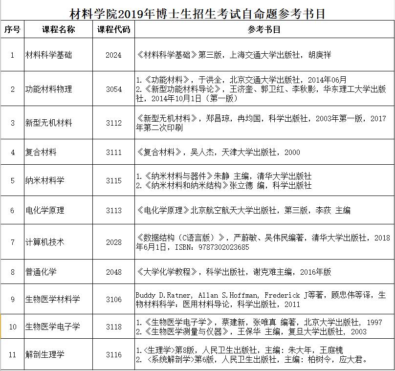 材料学院2019年博士生入学考试自命题参考书目