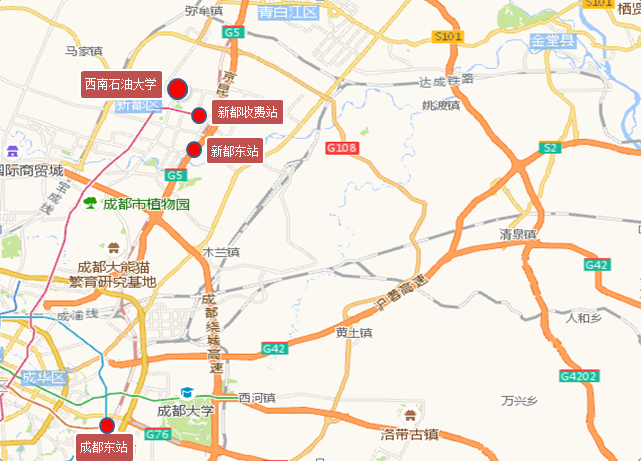 (2)成都火车站东站:乘坐火车到达成都火车站东站后,建议乘坐地铁7号线外环(开往迎晖路方向),经过9站到达驷马桥站换乘3号线(开往成都医学院方向),经过12站到达石油大学地铁站,从D出口出站步行约500米到达西南石油大学南大门,耗时约1小时。
