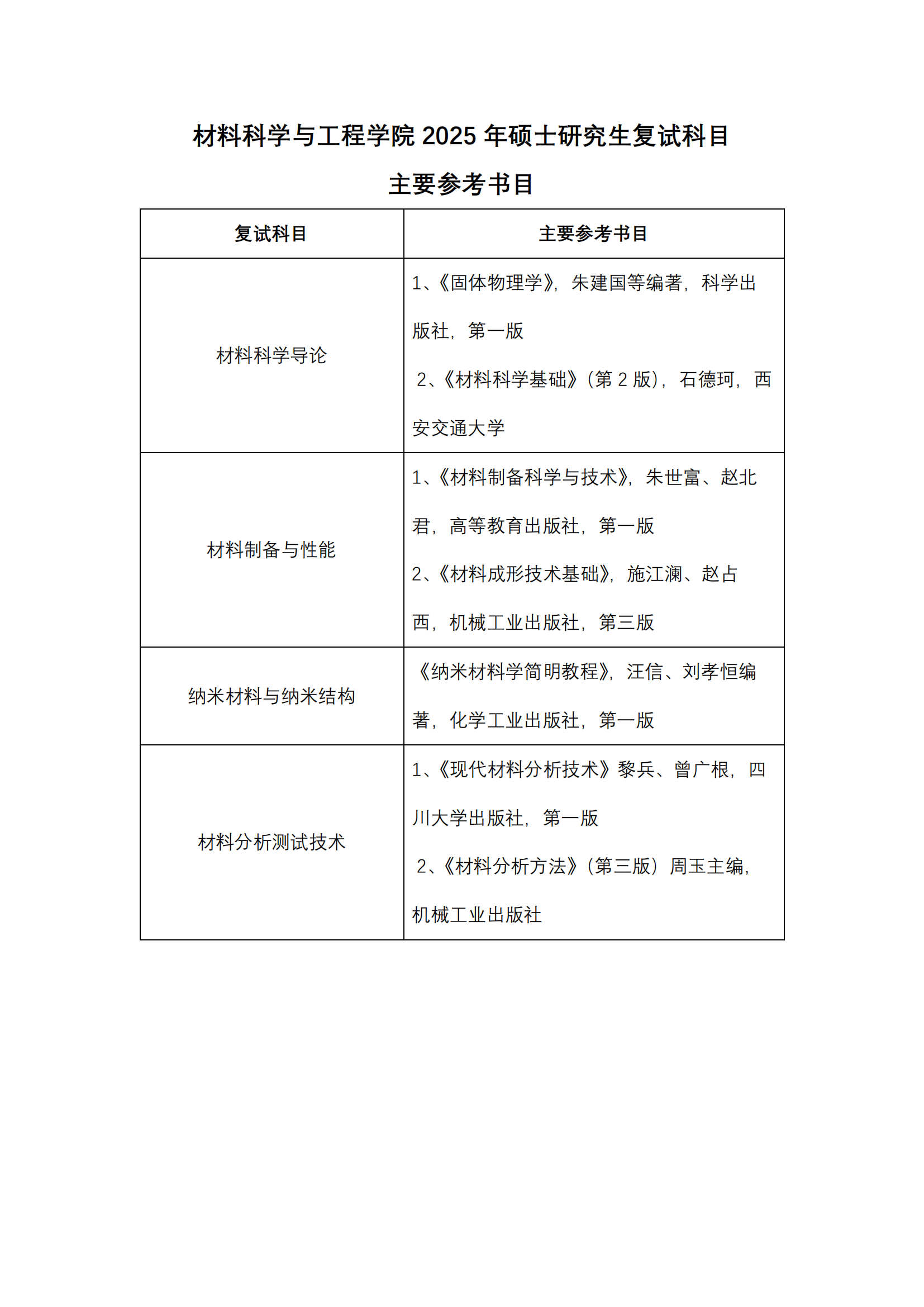 材料科学与工程学院2025年硕士研究生复试科目主要参考书目