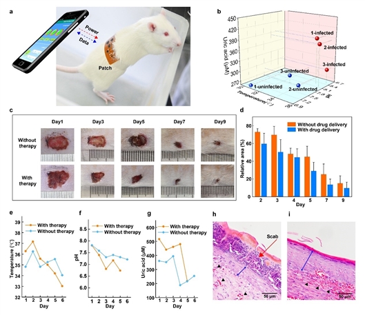 在这项实验中,课题组通过在小鼠体表伤口上接种金黄色葡萄球菌,形成感染伤口动物模型,将构建的智能“创可贴”贴敷于伤口,实现了良好的伤口监测与药物治疗效果。