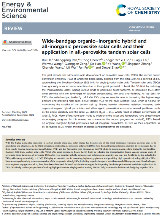 文章链接:“Wide-bandgap organic–inorganic hybrid and all-inorganic perovskite solar cells and their application in all-perovskite tandem solar cells”(https://pubs.rsc.org/en/Content/ArticleLanding/2021/EE/D1EE01562A#!)