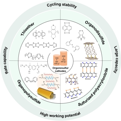近几年,锂离子电池在便携式电子设备和电动汽车领域获得了广泛的应用,显示出巨大的前景。然而,庞大的应用市场对电极材料的可持续性和成本问题提出了重大挑战,尤其是正极材料。目前,传统商用正极材料多是过渡金属类无机正极,例如LiCoO2、LiFePO4、LiMn2O4等。然而,过渡金属的储量有限、不可再生、回收成本高,从长远的角度来看终将面临资源短缺的困扰。因此,能够绿色大规模生产的低成本锂电池用正极材料备受关注。有机电极材料富含碳、氢、氧等元素,显现出可再生、绿色环保、低成本和高容量等优点,近年来受到了广泛的关注。其中,有机硫化合物作为一类重要的硫衍生物,与单质硫正极相比具有多种结构和独特性能,是锂离子电池体系中极具发展潜力的有机正极材料。