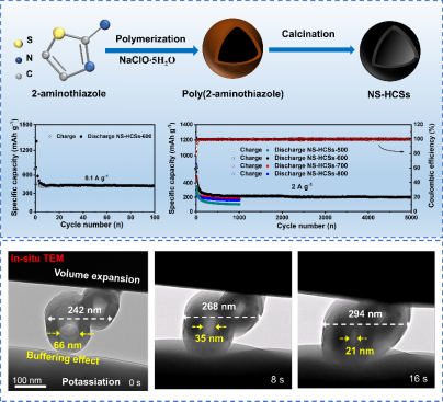 钾离子电池(PIBs)具备资源丰富、输出电压高等优势,有望在大规模储能、智能电网等多领域发挥重要价值。然而,K+的离子半径较大,其嵌入电极材料后引起严重体积膨胀,容易引发电极结构衰退,进而造成电池容量和倍率性能快速衰减。近日,我院张千玉副研究员等人在国际知名期刊Advanced Functional Materials上发表了题为“Mesoporous N,S-Rich Carbon Hollow Nanospheres Controllably Prepared From Poly(2-aminothiazole) with Ultrafast and Highly Durable Potassium Storage”的研究论文(DOI: 10.1002/adfm.202301987)。该篇文章提出富含N,S中空碳纳米球(NS-HCSs)作为高容量、能快速稳定储钾负极材料。