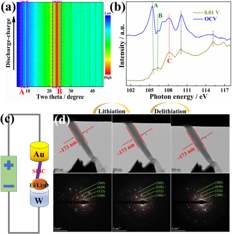 图3. (a)SLIC充放电时的原位XRD图;(b)SLIC在OCV和0.01V时的Si L-edge XANES谱图;原位TEM的(c)测试装置图和在充放电过程中的(d)形貌和SAED图