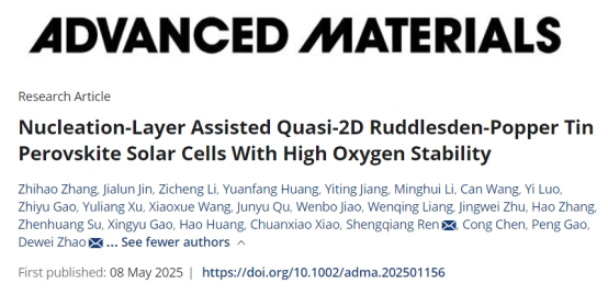 5月8日,国际学术期刊Advanced Materials在线发表了材料科学与工程学院赵德威教授团队题为“Nucleation-Layer Assisted Quasi‐2D Ruddlesden‐Popper Tin Perovskite Solar Cells With High Oxygen Stability”的研究成果。Advanced Materials由美国Wiley出版社主办,是材料科学领域的国际权威期刊,川大A-级期刊,最新影响因子为27.4。本工作报道了一种形核层辅助(NLA)策略,通过调控准二维Ruddlesden-Popper(RP)锡基钙钛矿的相分布、晶体取向、薄膜形貌,实现了高度氧稳定的准二维RP锡基钙钛矿太阳能电池,同时创下了锡基钙钛矿太阳能电池氧稳定性的纪录。
