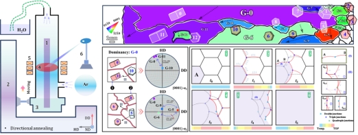 本研究聚焦Ti-48Al-2Cr-2Nb合金,创新性地采用局域控温及热区移动的固态定向退火技术(Directional Annealing),通过精确控制热区温度及迁移速率,成功制备了~40 mm柱状晶组织(图1)。同时,首次尝试了非恒定热区迁移速率对α柱晶生长影响的研究工作,并结合原位高温观察和多尺度表征,揭示了晶界耦合台阶(GB coupling steps)在协调双结点晶界迁移速率差异中的关键作用,阐明了晶界迁移受晶界曲率主导的动力学规律。