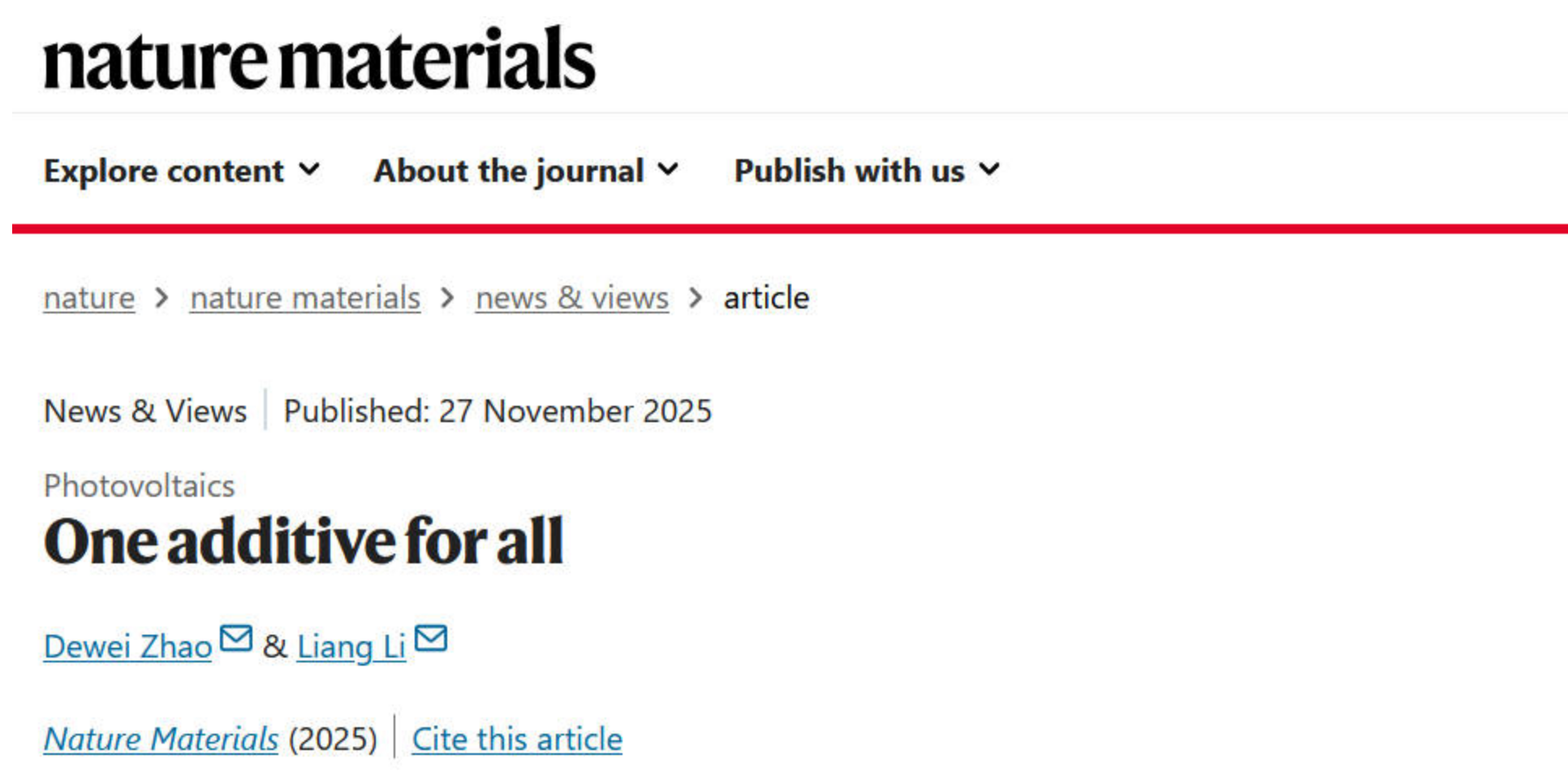 近日,权威科学期刊Nature Materials刊发了我校材料科学与工程学院赵德威团队关于高性能叠层太阳能电池的通用型添加剂的News & Views观点文章“One additive for all”。赵德威教授为论文第一作者,赵德威教授和苏州大学李亮教授为论文共同通讯作者,我校为论文的第一通讯单位。