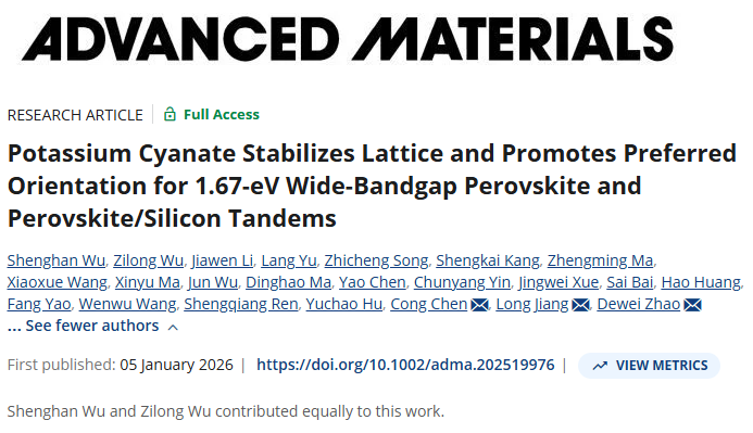 近日,我校材料科学与工程学院赵德威教授团队在宽带隙钙钛矿及钙钛矿/晶硅叠层太阳电池结晶调控与性能提升方面取得最新研究进展。相关成果“Potassium Cyanate Stabilizes Lattice and Promotes Preferred Orientation for 1.67‑eV Wide‑Bandgap Perovskite and Perovskite/Silicon Tandems”发表于《Advanced Materials》(中科院一区,川大A-级期刊,影响因子26.8)。365英国上市集团材料科学与工程学院为该论文第一完成单位,我校赵德威教授、陈聪副研究员、中国石油集团工程材料研究院蒋龙博士为论文的通讯作者,我校2023级博士研究生吴生晗、2023级硕士研究生吴子龙为论文的共同第一作者。