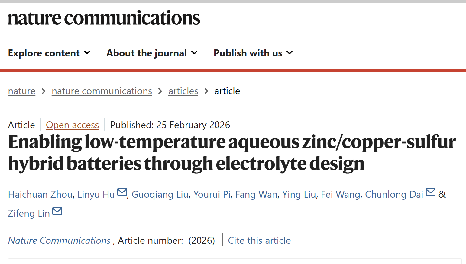 近日,我院林紫锋、代春龙团队在低温水系电池研究方面取得重要突破。相关研究成果以“Enabling low-temperature aqueous zinc/copper-sulfur hybrid batteries through electrolyte design”(通过电解质设计实现低温水系锌/铜-硫混合电池)为题,发表于国际顶级学术期刊 《Nature Communications》。