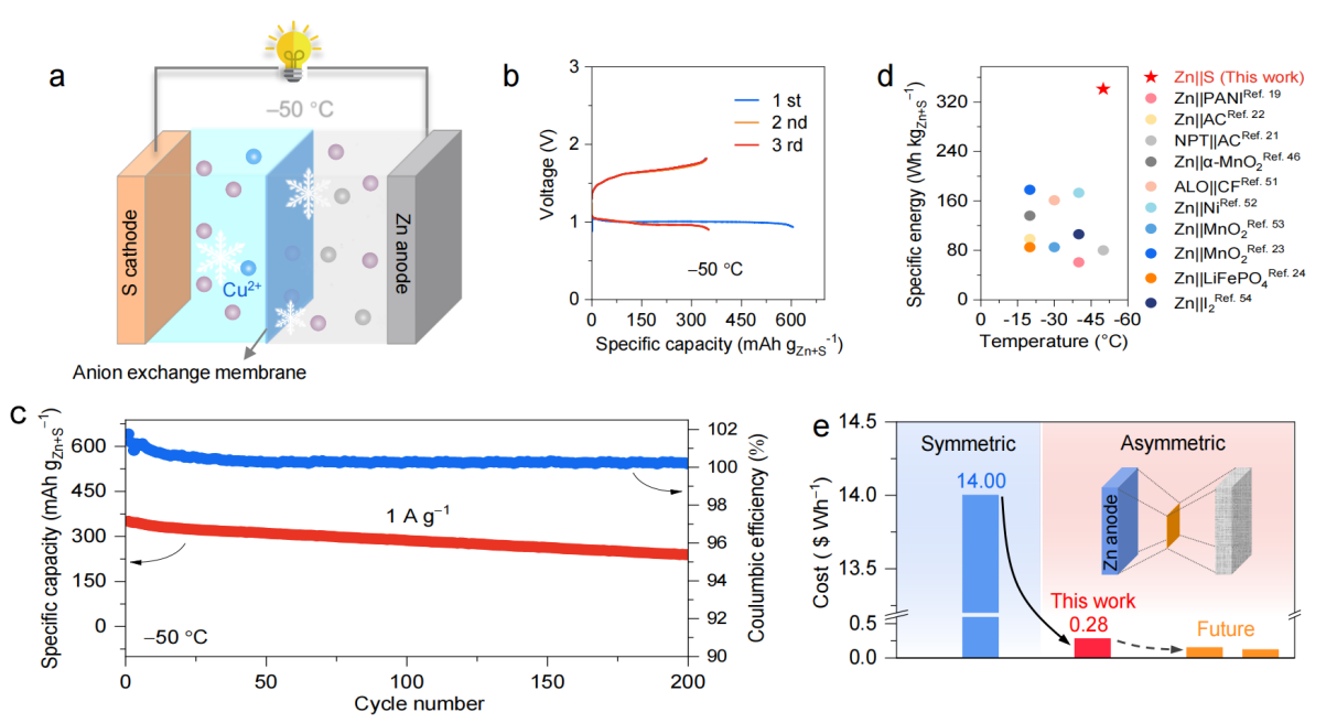 图1. 低温锌-硫电池示意图及电化学性能