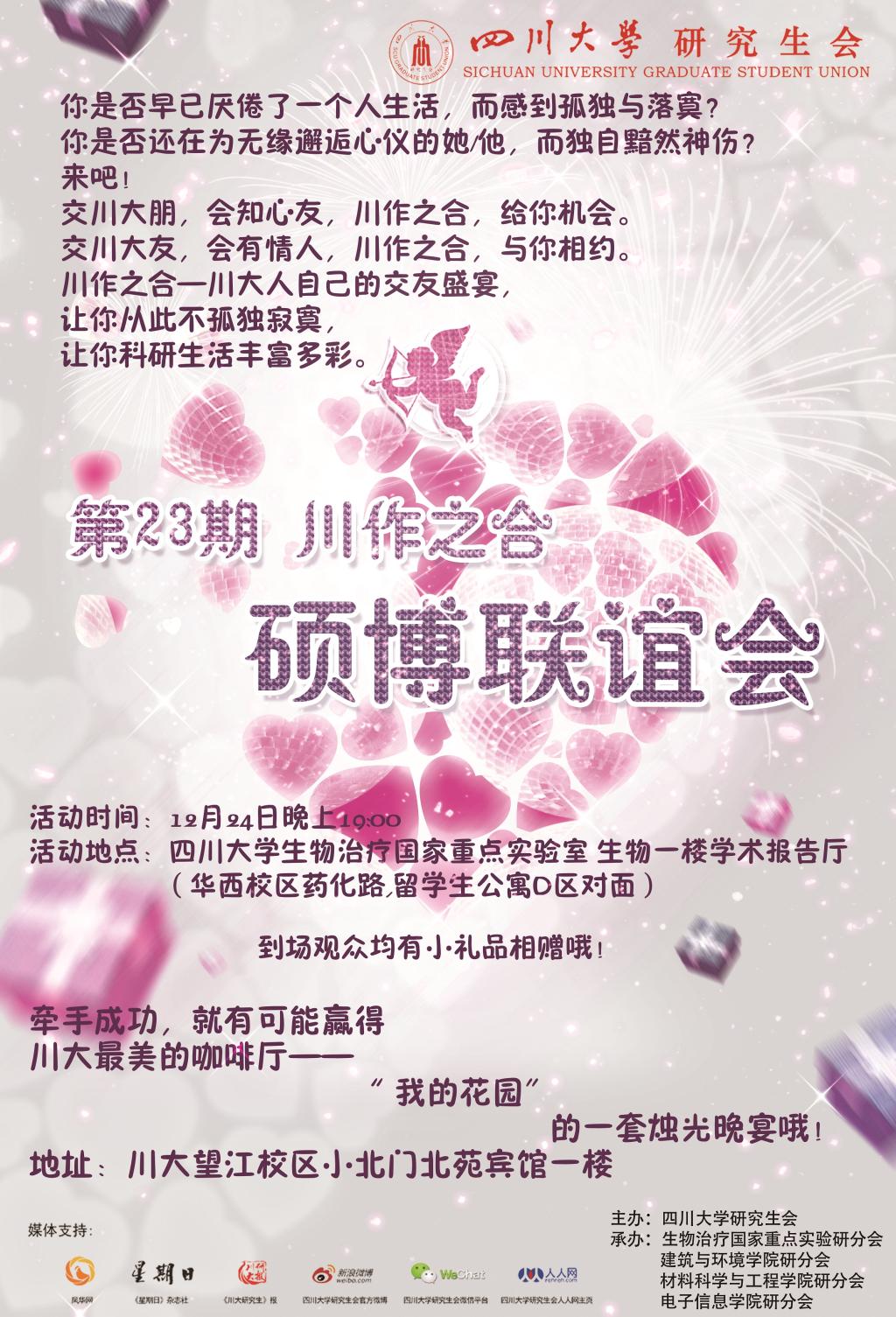 365英国上市集团研究生会迎新年系列活动之“川”作之合大型联谊活动—“任性”礼物等你来拿!这里有最资深的评委阵容,最酷炫的舞台表演,还有最精彩的体验游戏。有你更精彩!期待你的参与!牵手成功就有可能赢取,川大望江校区小北门北苑宾馆一楼,川大最美咖啡厅-我的花园的烛光晚宴哦!还有平安果和精美礼物在等着你,数量有限,先到先得!相信你所期待的绝不只是红苹果,更重要的还有梦中相遇、命中注定的那个Ta!无论你是顺路凑个热闹,还是早有预谋想捡个“馅饼”,12月24日平安夜,让我们一起期待——幸福暖冬,川大热恋!