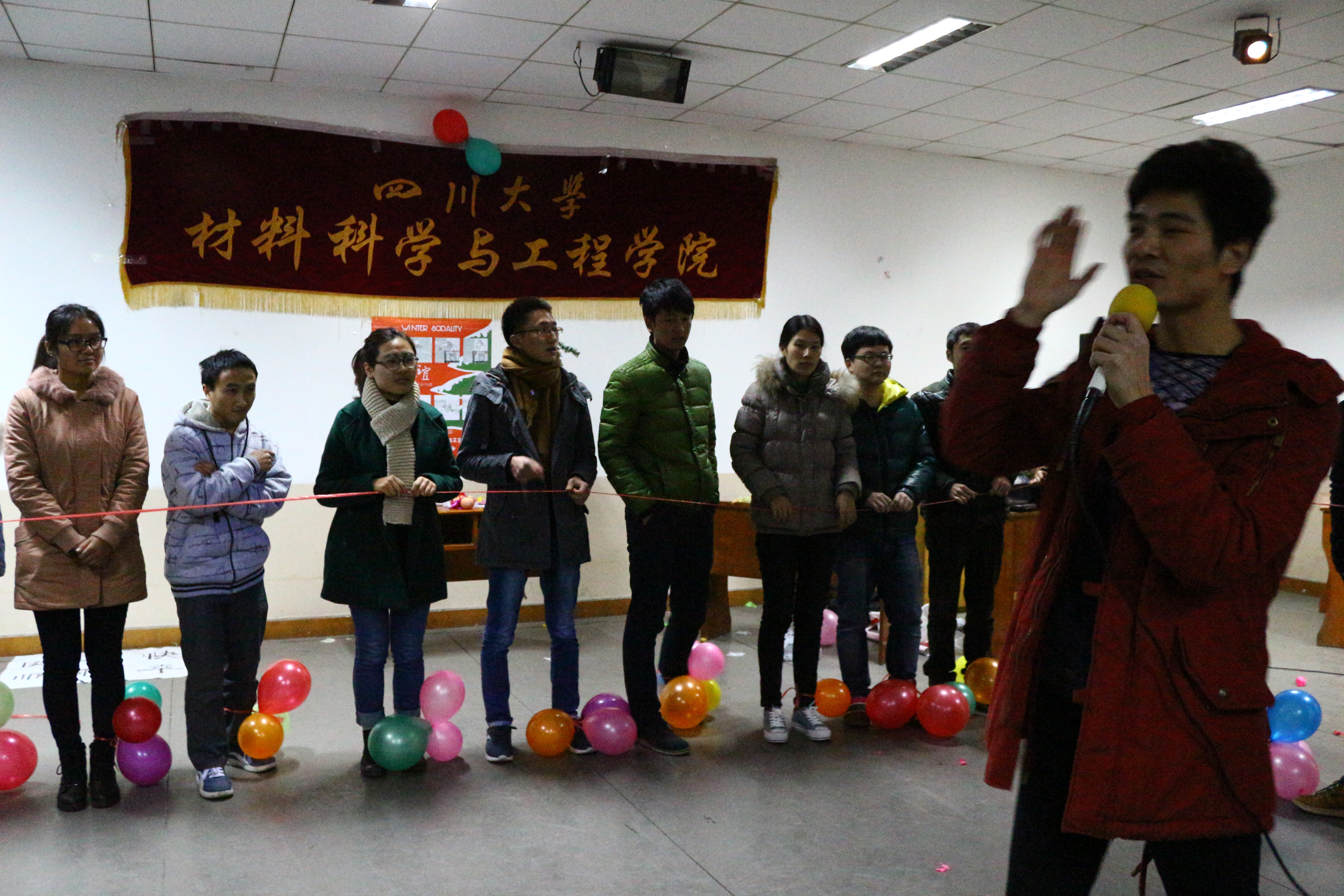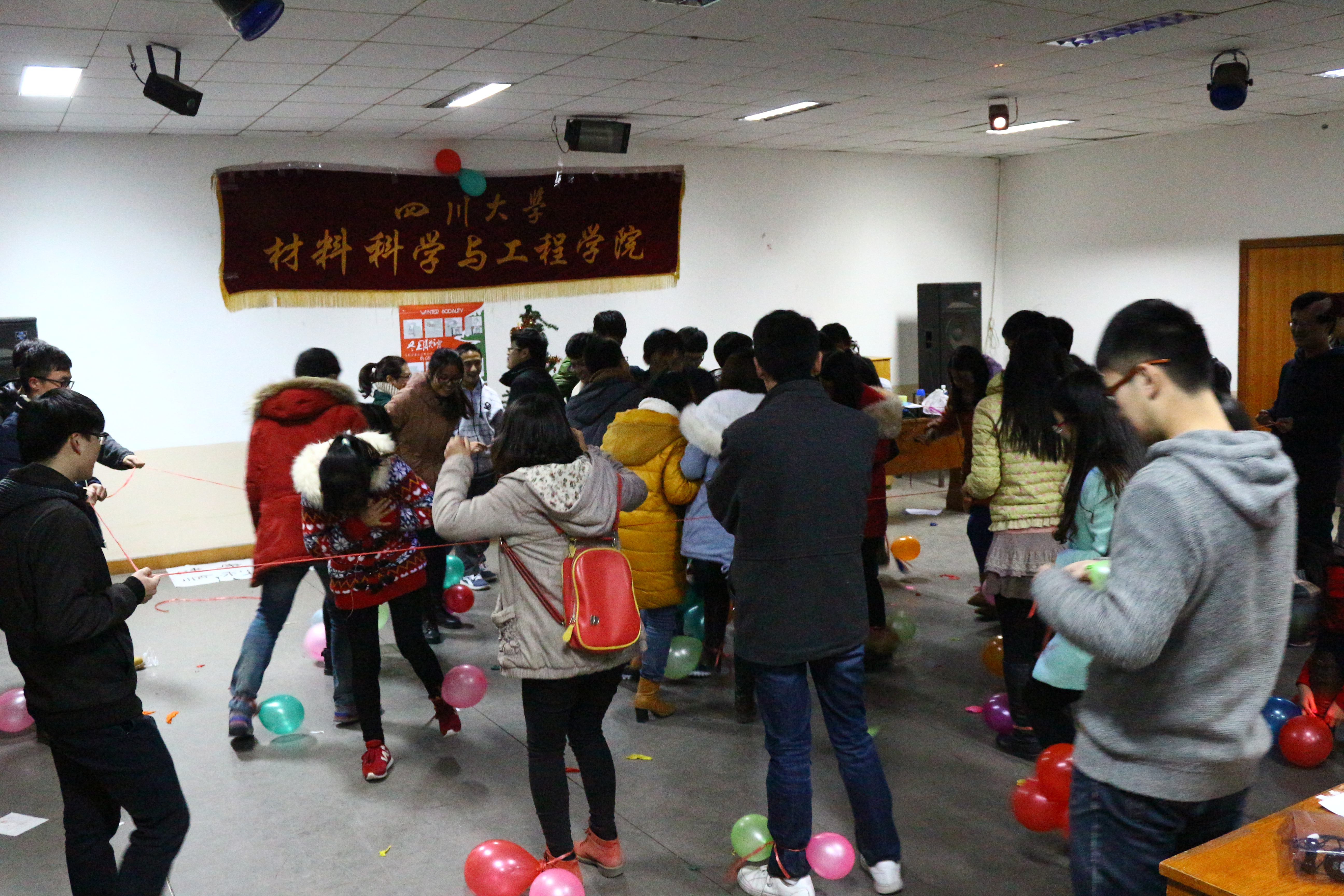 2014年12月23日晚7点,材料学院众多研究生欢聚在西区活动中心三楼文艺小厅,共度一个欢乐愉快的冬夜。大家欣赏着同学们精心准备的各种晚会节目,彼此传达着关心和祝福,共同参与到好玩的游戏中。现场气氛沸腾火热,同学们在紧张的学习和科研工作之余展示文艺才能,释放真正自我,尽显青春的活力。
