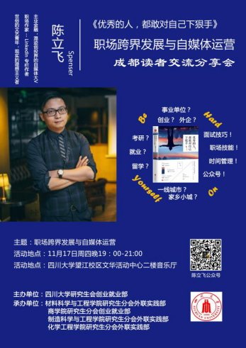 我们有幸邀请到媒体达人陈立飞老师,他是LinkedIn(领英中国)专栏作者,是一篇微文拉动百万融资的自媒体大V。此次交流会陈老师将为我们讲述面对不同生活方式,该何去何从。同时他会分享一些亲身经历,更有关于写作和自媒体的经验交流 。同学们还可以与老师进行深入交流,近距离感受成功人士的魅力!这里没有无聊的励志和温情的鸡汤,有的只是猛药!