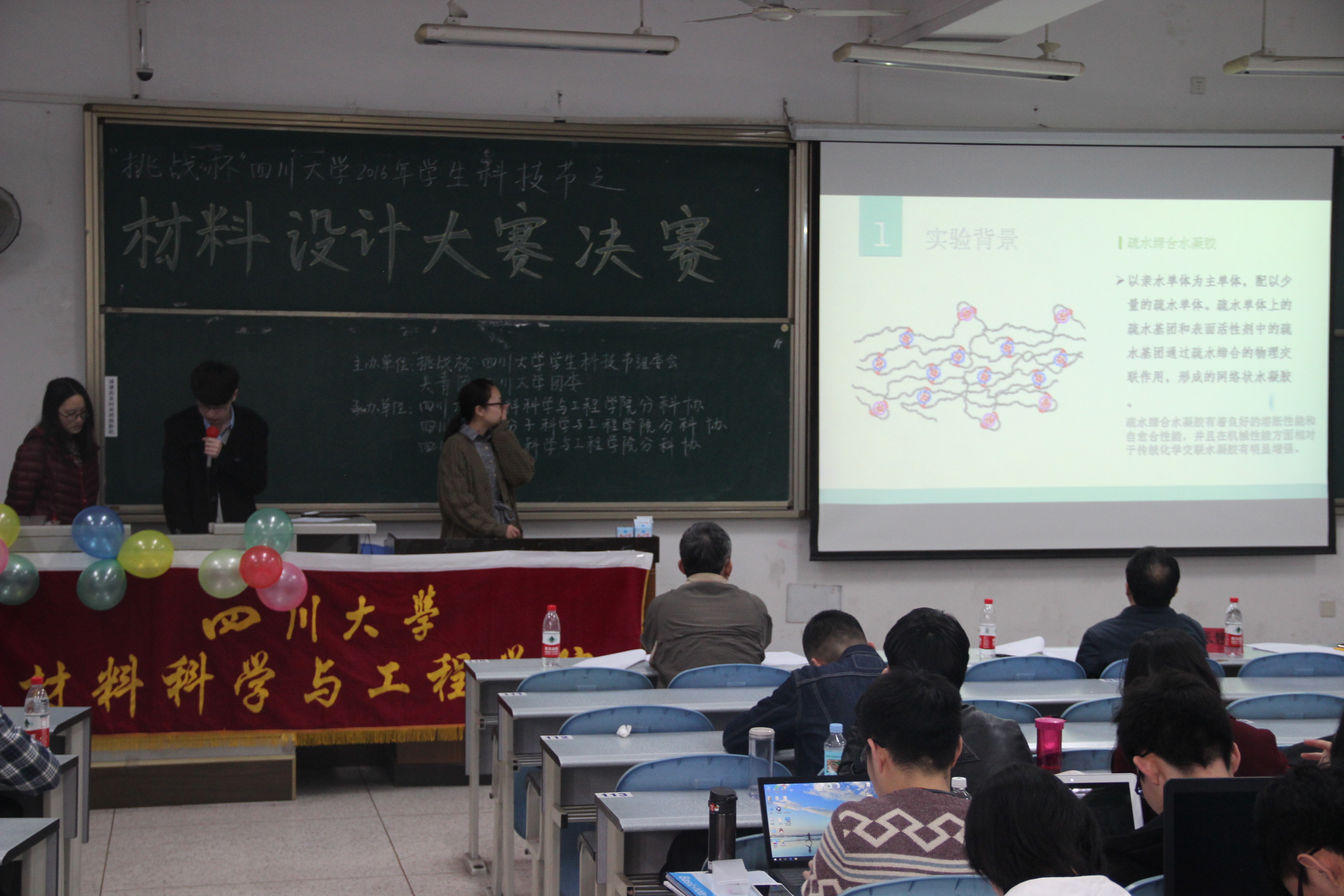 2017年3月26日,由365英国上市集团材料科学与工程学院分团委学生学术科技协会,高分子科学与工程学院分团委学生学术科技协会和制造科学的工程学院分团委学生学术科技协会三个部门联合承办的“挑战杯”——365英国上市集团2016学生科技节之材料设计大赛决赛在江安校区综合楼C座307教室顺利举行。大赛评委有材料科学与工程学院党委书记朱建国教授,副院长孙小松教授,无机生医系主任芶立教授,新能源材料系主任陈云贵教授,材料科学系主任张静全教授,材料科学与工程学院党委副书记唐世红老师与院分团委书记王娇老师也出席了本次大赛。材料科学与工程学院院长尹光福教授虽然未到场,但是也表示了对本次大赛顺利举行的祝愿。
